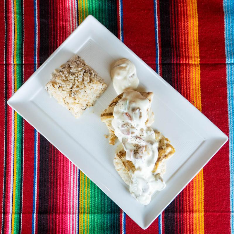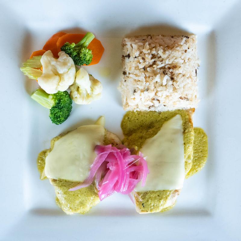 Grilled chicken breast, creamy tomatillo sauce, Swiss cheese, pickled red onions, white rice, and vegetables.