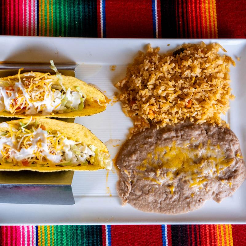 Two crispy tacos, ground beef, lettuce, cheese, tomato, crema, rice, and refried beans.