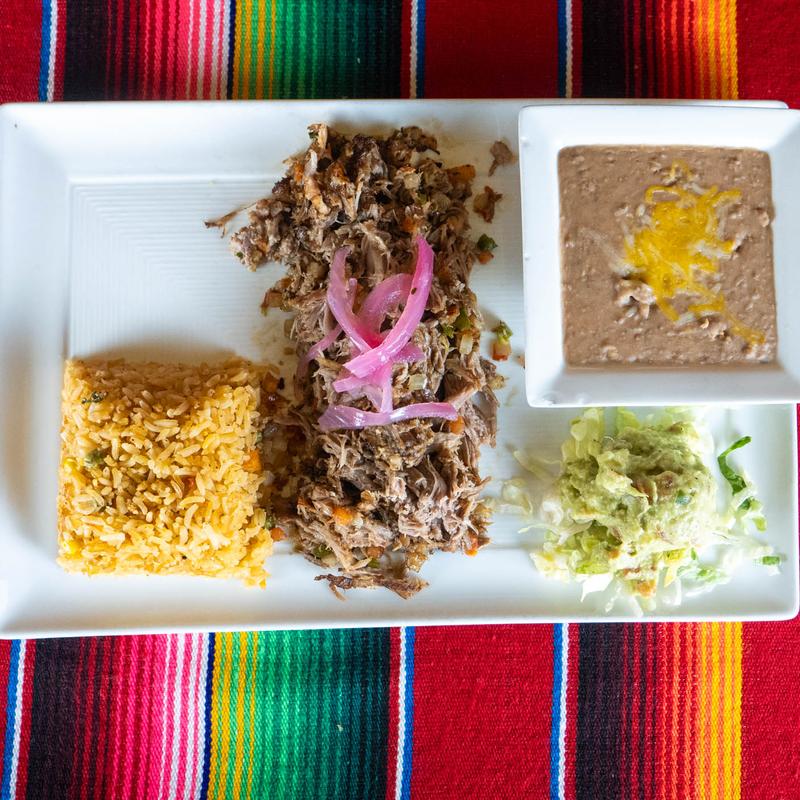 Seasoned slow-roasted pork loin, rice, refried beans, guacamole, pico de gallo, and four tortillas.
