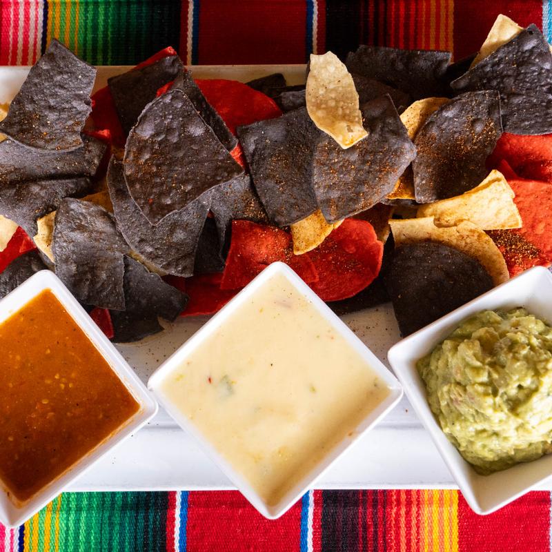 Salsa, con queso, guacamole, and trio-colored chips.