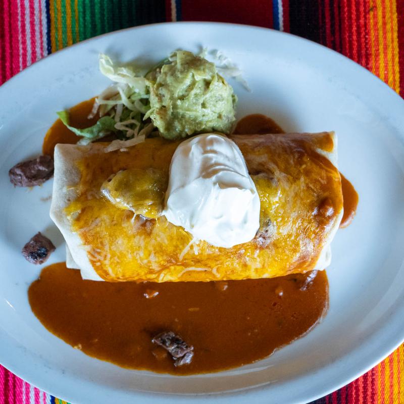 One flour tortilla, ancho chile sauce, cheese, crema, refried beans, and rice • Choice of meat: Ground Beef or Chicken.