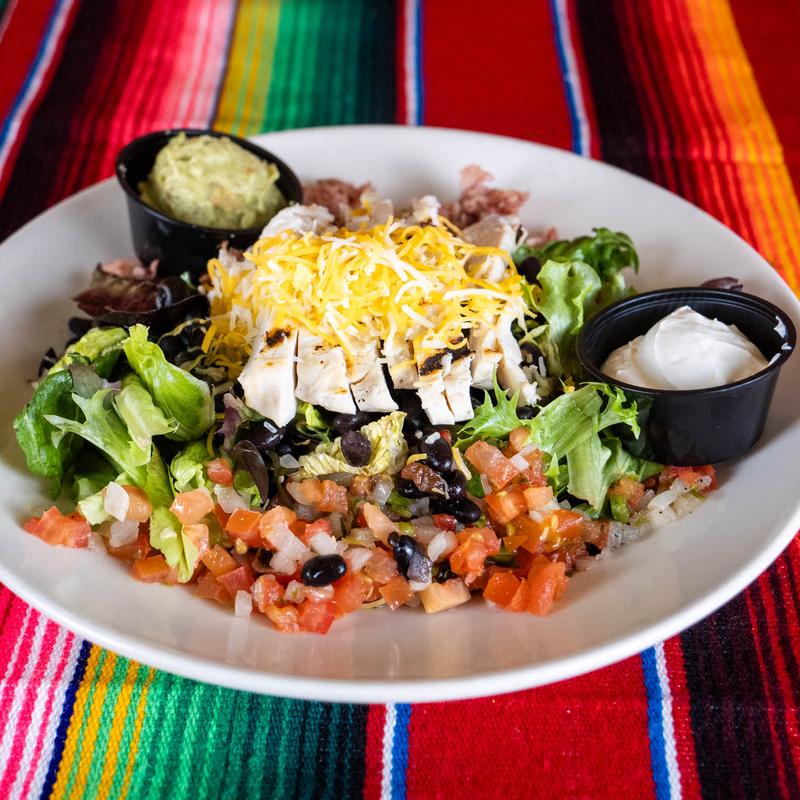 Grilled chicken breast, bacon black beans, mixed greens, romaine lettuce, cheese, pico de gallo, crema, and guacamole.