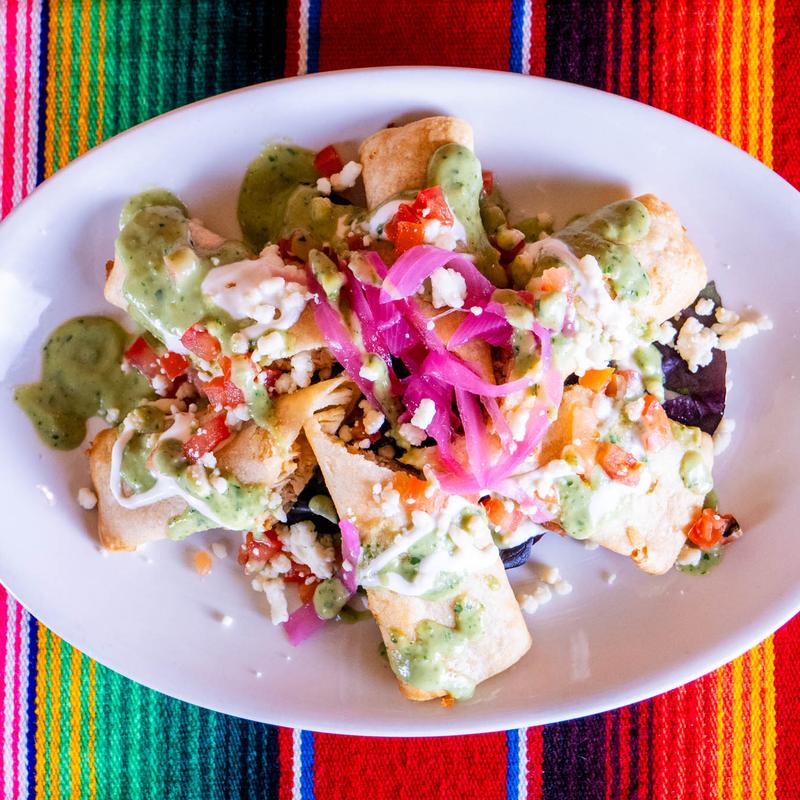 Flour tortilla rolled and fried, shredded chicken, cheese, drizzled with crema, tomatillo avocado sauce, and cup of charro beans.