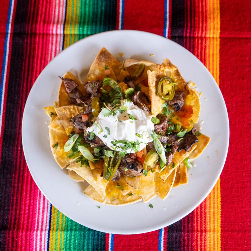 Chips, refried beans, cheese, jalapeños, tomato, onion, crema, and cilantro • Choice of Meat: Grilled Chicken +$4.00 | Carnitas +$5.00 | Ground Beef +$4.00 | Chorizo +$4.00
