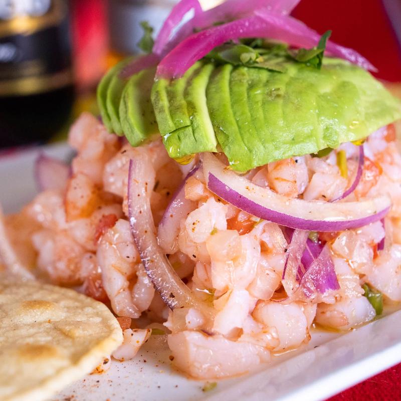 Shrimp, olive oil, red onions, cilantro, tomato, lemon juice, avocado, peppers, and tostadas.