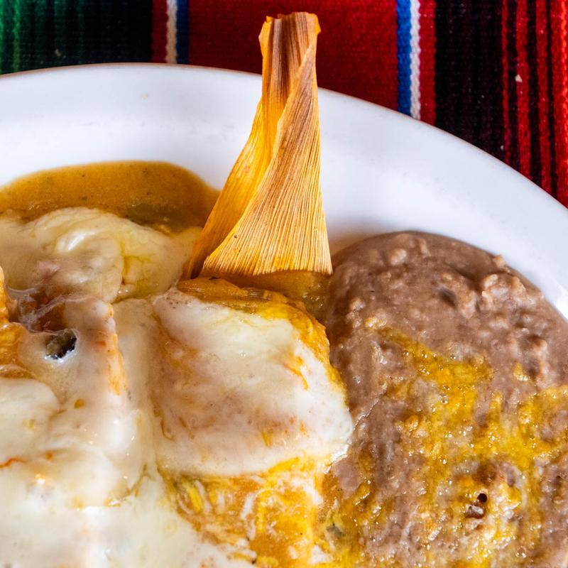 Two shredded pork tamales, green chile, habanero jack cheese, rice, and refried beans.