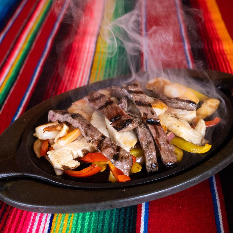 Chicken Breast $23.95 | Sirloin Flap Steak $26.95 | Gulf Shrimp $26.95 | Portobello Mushroom $22.85 | Combo Fajitas (chicken, shrimp, steak) $37.40 • Grilled tri-colored peppers, grilled onions, rice, refried beans, lettuce, guacamole, crema, and three warm tortillas.