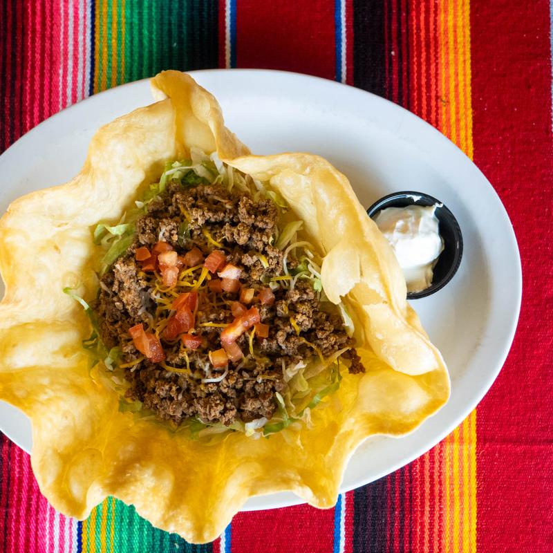 Crispy flour tortilla shell, ground beef, refried beans, lettuce, tomato, crema, and cheese.
