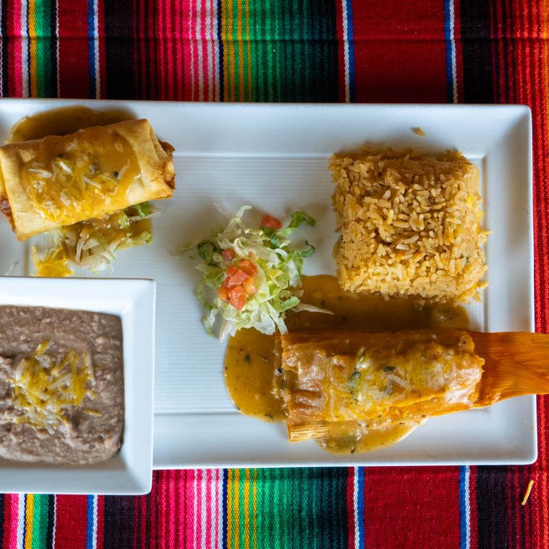 Two enchiladas, refried beans, rice, and lettuce • Add choice of: Chicken | Beef | Cheese (V)