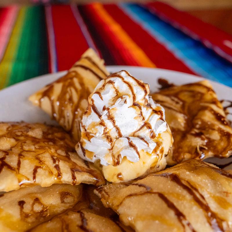 Fried pastry, sprinkled cinnamon & sugar, honey, chocolate syrup, scoop of vanilla ice cream, and whipped cream.