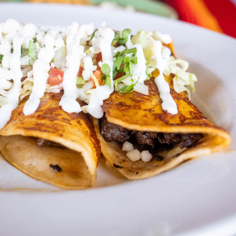 Deep-fried rolled corn tortilla, ground beef, crema, tomatillo avocado sauce, cheese, and lettuce.